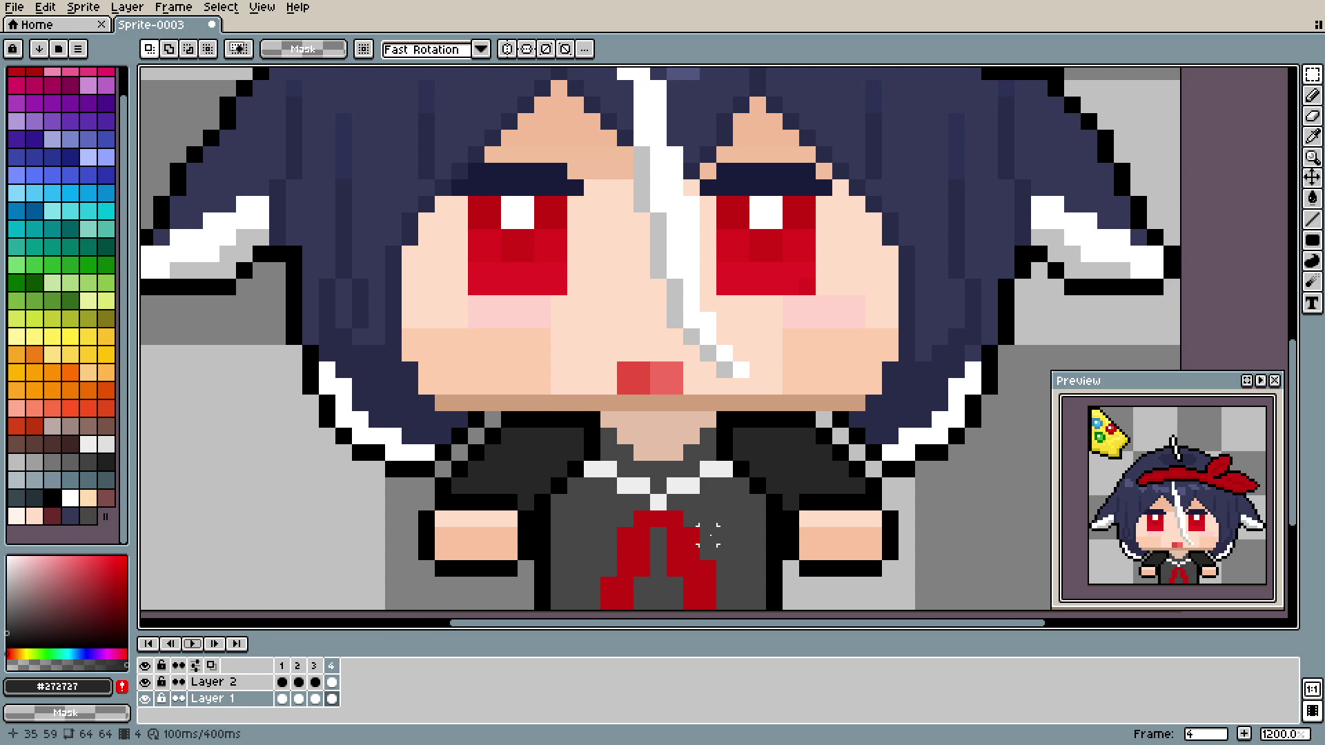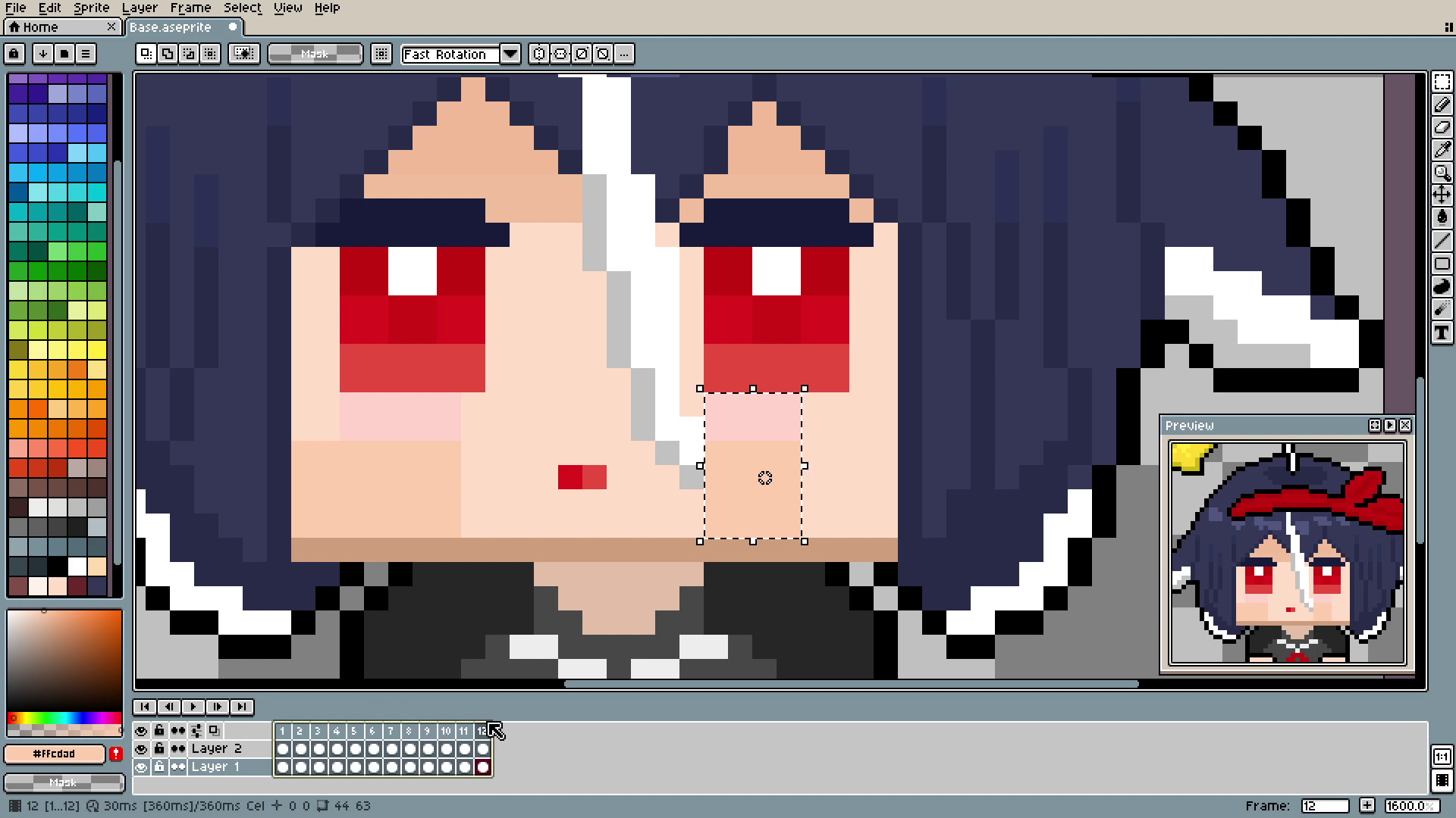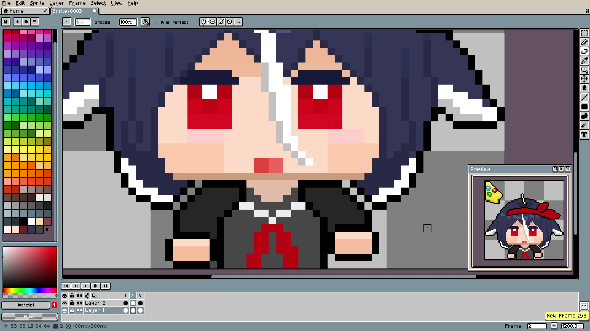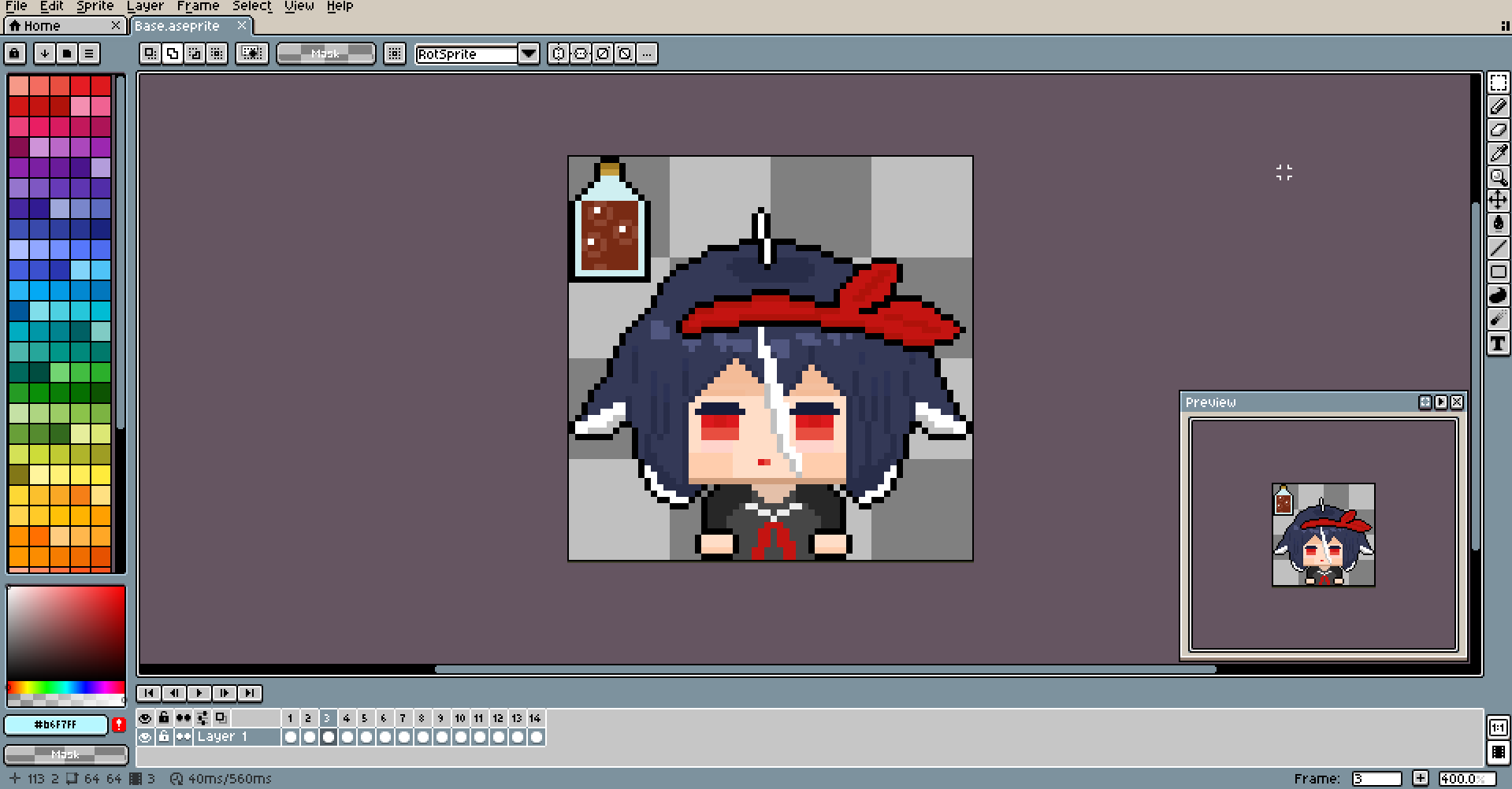 A small but important change happened here. I realized that I had to create the new arm position for every hard movement. Because of the nature of the chibi, it looked really weird, like the whole body was shaking. Instead, I made the whole body one "block" and didn't animate it at all. It saved sooooo much time, believe me.