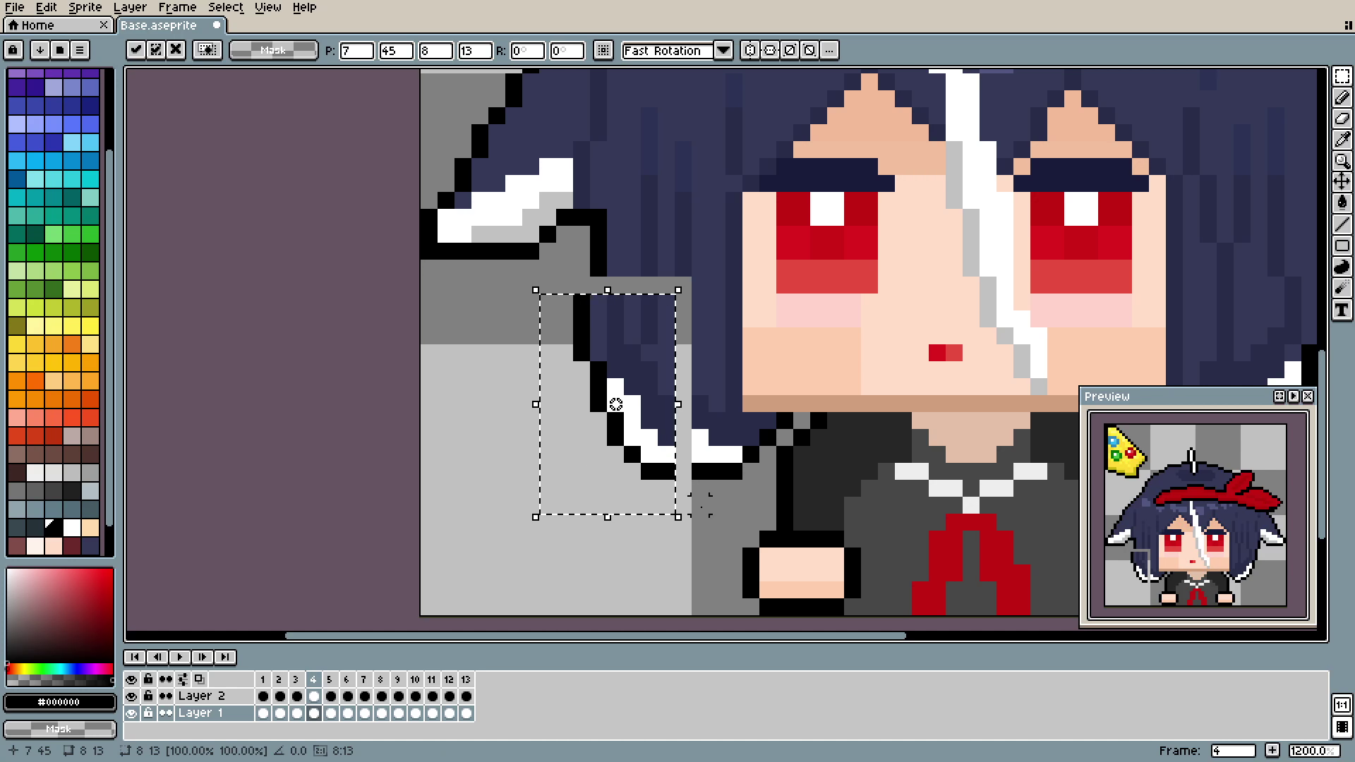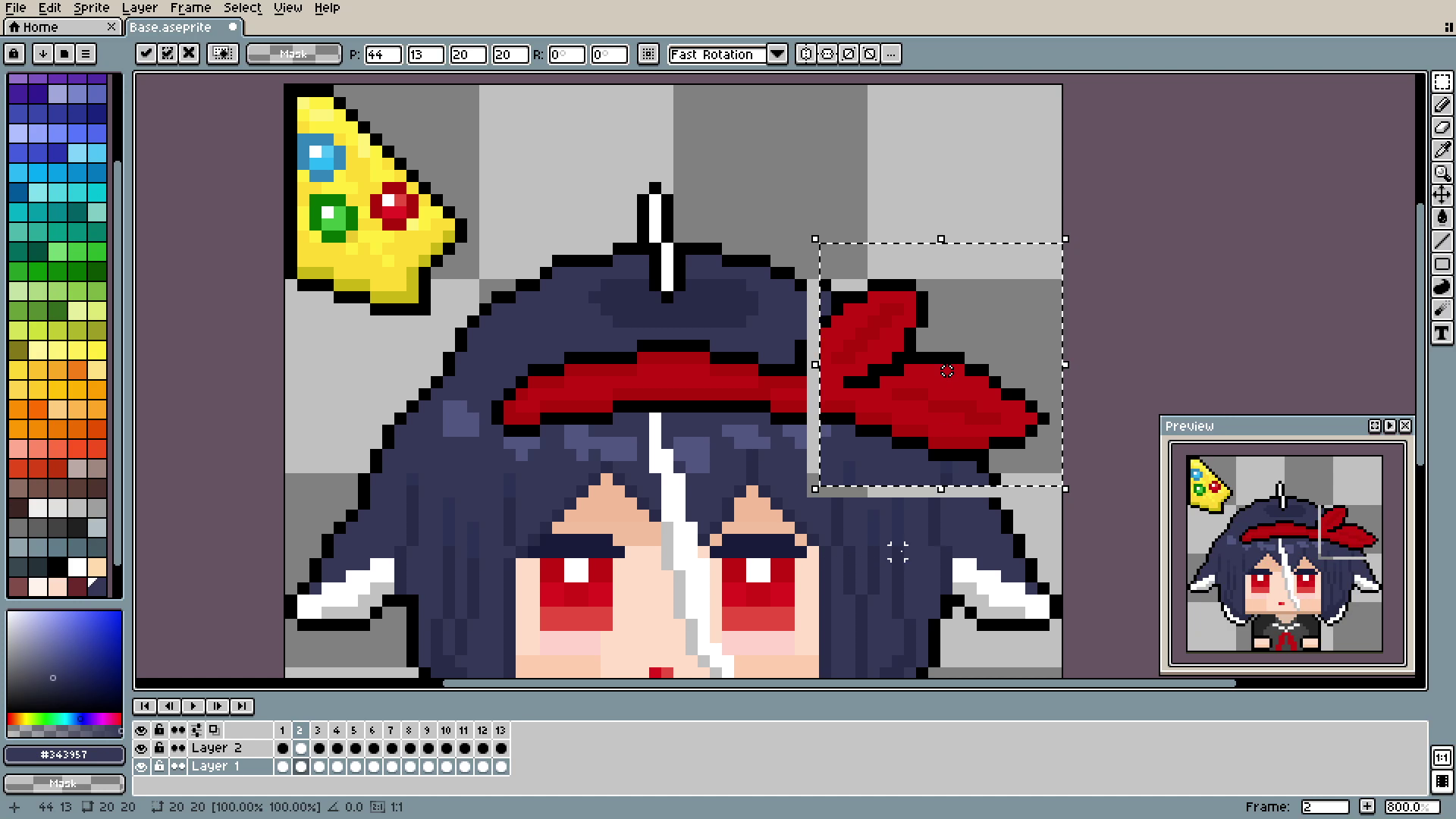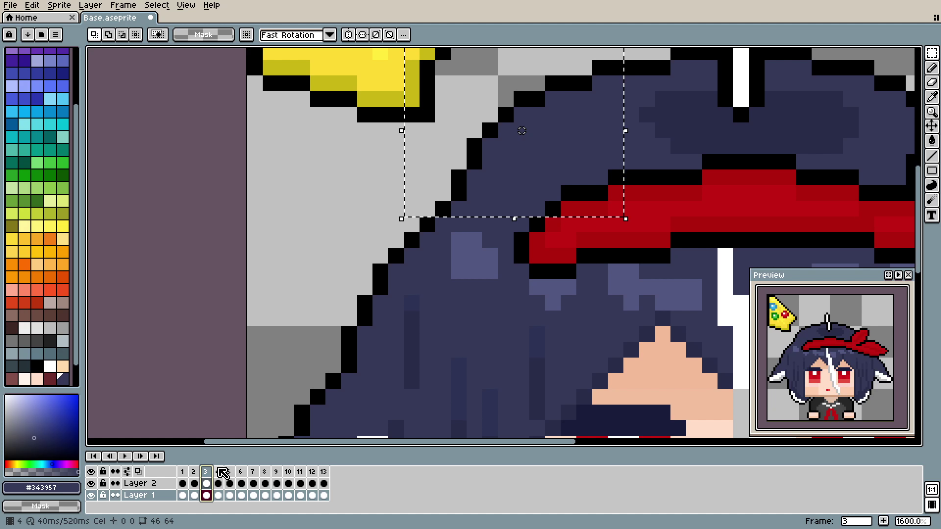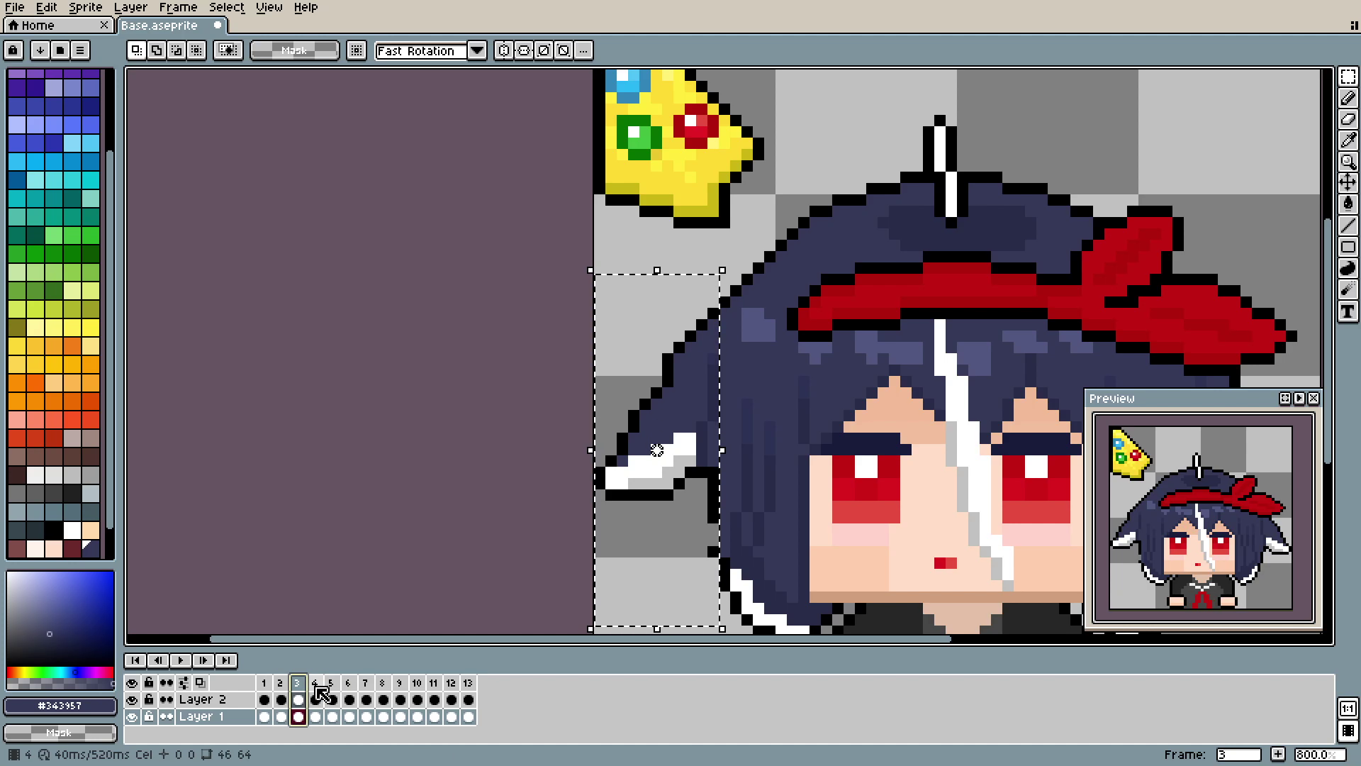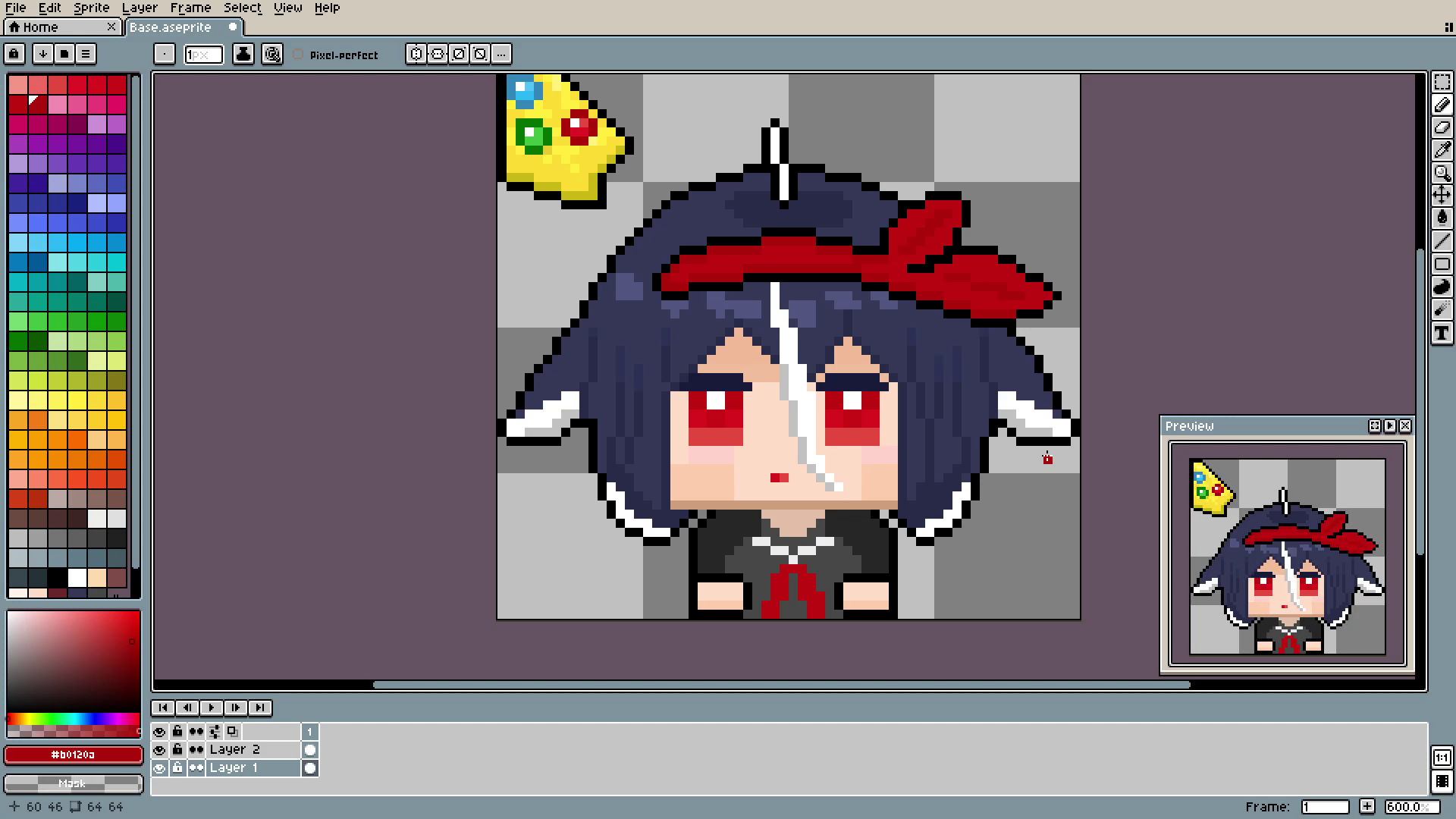 A small but important change happened here. I realized that I had to create the new arm position for every hard movement. Because of the nature of the chibi, it looked really weird, like the whole body was shaking. Instead, I made the whole body one "block" and didn't animate it at all. It saved sooooo much time, believe me.
