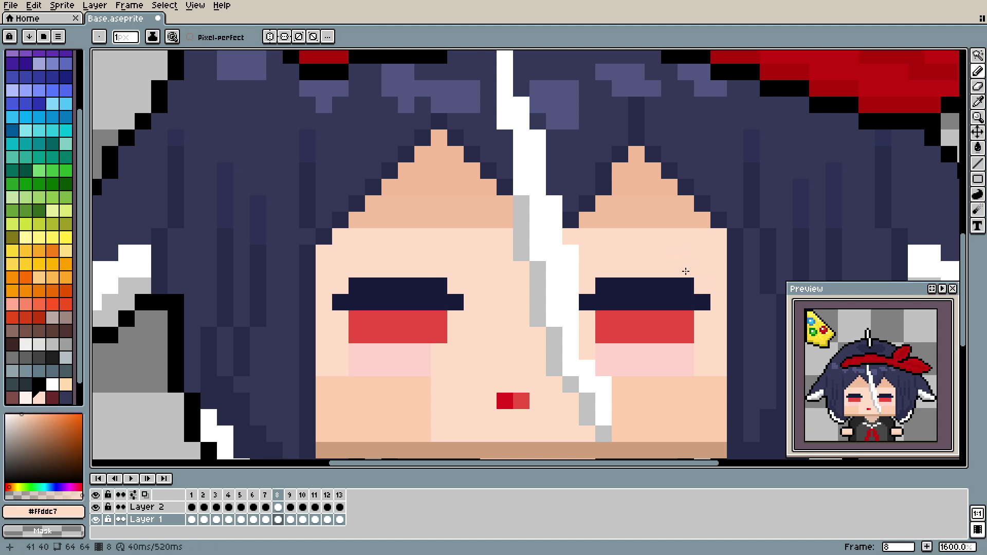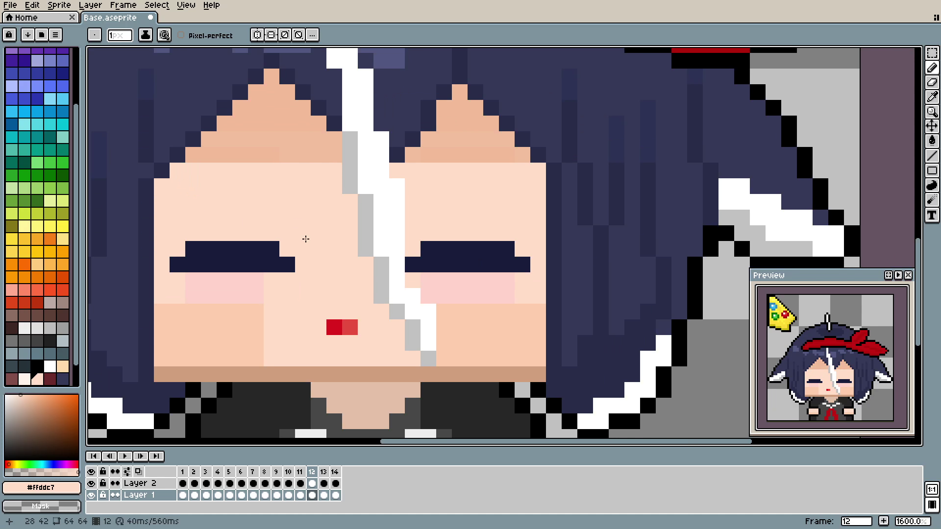 Now the eyes. My first instinct was the same as with the hands: one pixel, one frame. I made it all the way through, only to realize that it looks terrible. Now there is only an open and closed position and 3 in between them. Eye movement is also made on double frames: every position uses 2 frames out of 14 and leftovers are used to keep the eyes open for a little.